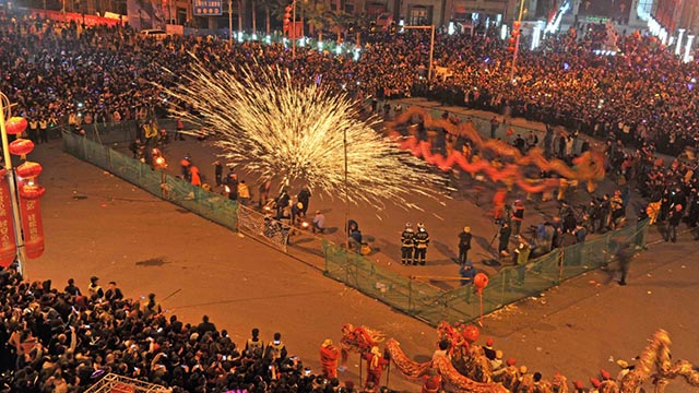 在这些民俗中,元宵节的闹元宵可谓白沙最具魅力的“民间习俗”。每年元宵节,白沙古镇都要进行祭码头、抓龙麟、舞龙狮、烧龙灯、打铁水等节庆表演,整个场面颇为壮观。伴随着喧天的锣鼓和震耳的炮竹声,舞龙舞狮的队伍在火花四溅的铁水中穿梭,火树银花,绚丽夺目,构成一幅“人在火中舞,龙在火中飞”的绚烂节日景象。